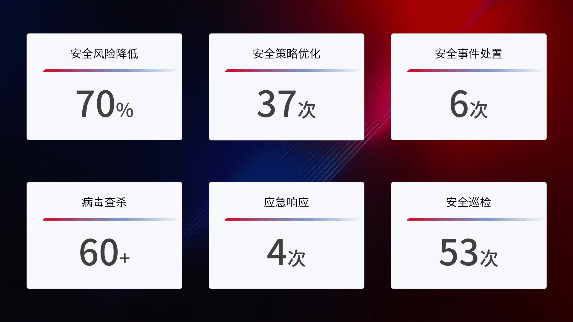 提供全面的安全事件报告体系,,,,包括处置报告、、、、周报、、季度和年度总结,,结合持续监控,,帮助客户深入了解网络安全状况。。。